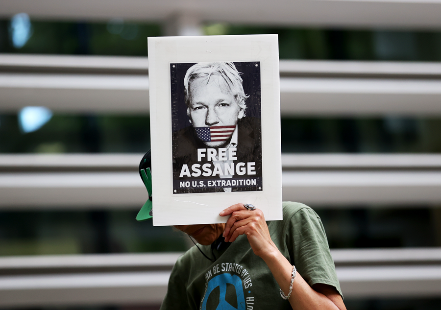 2022年5月17日,一名示威者在伦敦英国内政部大楼门前手举“释放阿桑奇”标语。凯发k8官网记者李颖摄
